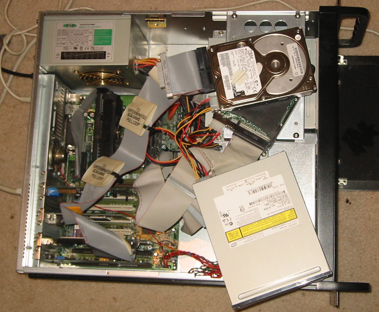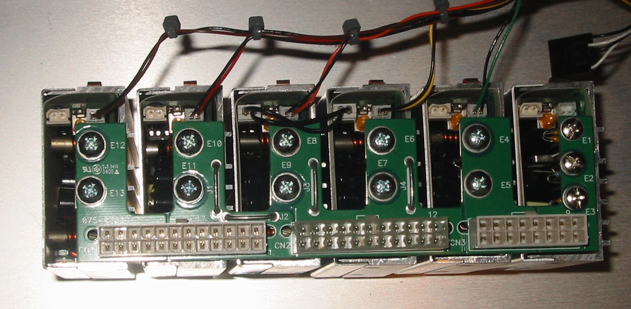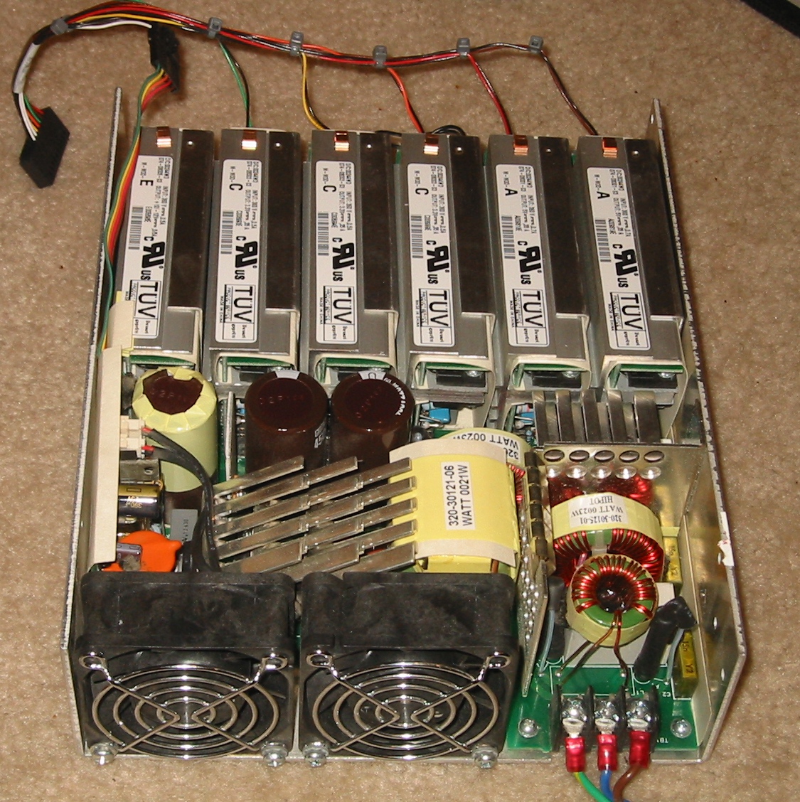 Removing the case involves removing the 6 screws on the sides (3 per side) and removing the handle. Then the top just comes off. The very large transformer absolutely dominates the inside, along with the interesting heatsink/air tunnel doodad that is directly cooled by the fan. That transformer seems to have at least 11 windings on it for the various supply voltages.