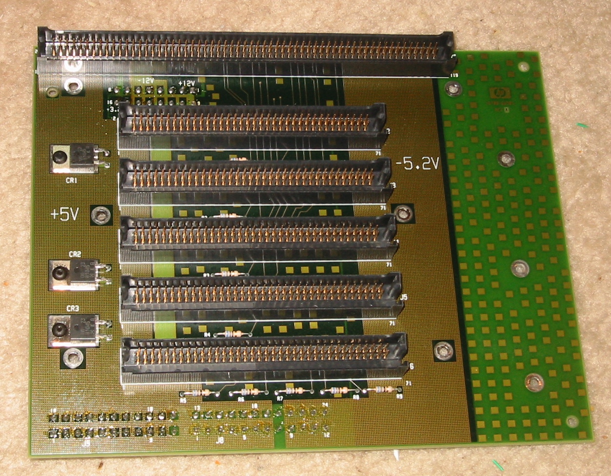 On the right side, there’s a riser board which contains no less than 6 regulators. The three on heatsinks are all 7805’s while the other three are a 7805, 7815? and 7915 I think for the 0-6V supply. The relays and big .3 ohm resistors are for current sensing and emitter swamping. The ribbon cable connects to the CPU board in front from the GPIB slot.